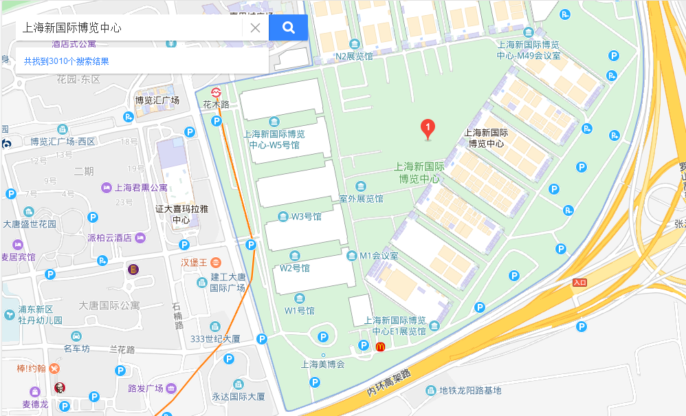 上海新國際博覽中心戰略性地坐落于浦東經濟開發區,距離上海新國際博覽中心600米處有一大型交通樞紐站,即龍陽路站(位于龍陽路上),包括多條路公交線路起點站、軌道交通2號線龍陽路站、軌道交通7號線龍陽路站以及磁懸浮列車終點站。從2號線龍陽路站步行到展館大約需10分鐘;從7號線花木路站步行到展館大約1分鐘。
