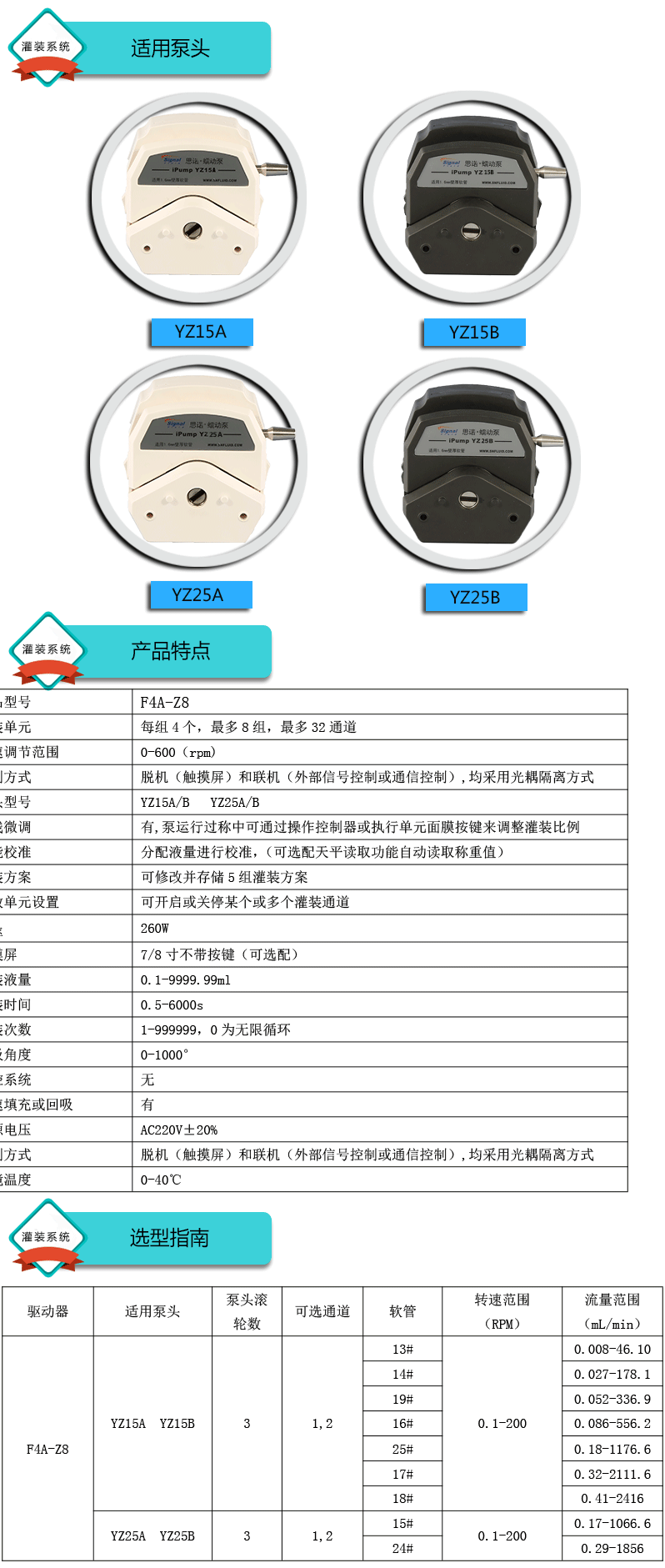 ? ? ?1.灌裝系統(tǒng)由4組基本通道(可擴(kuò)展至32通道),一臺(tái)控制器組成,可安裝YZ15、YZ25泵頭