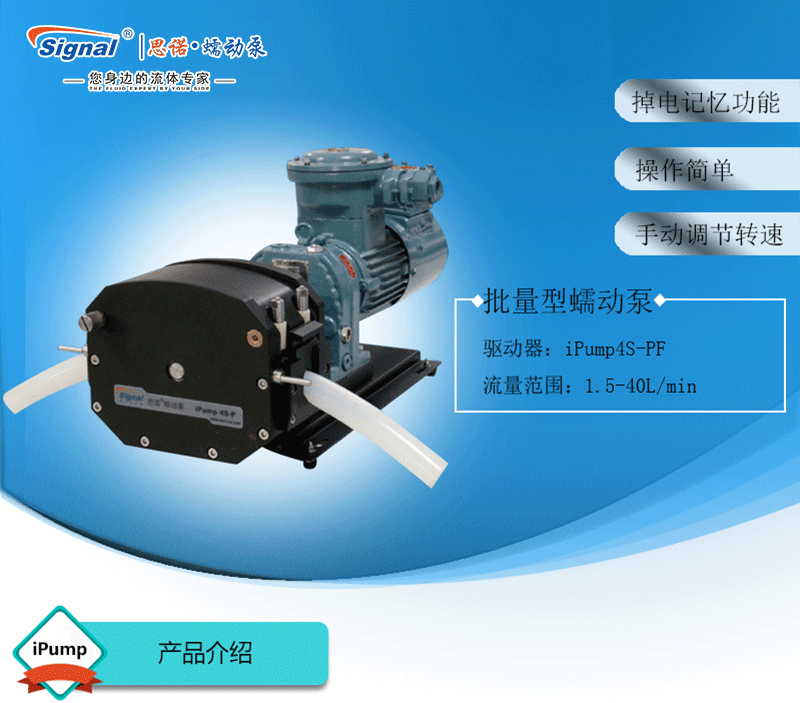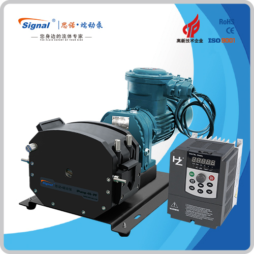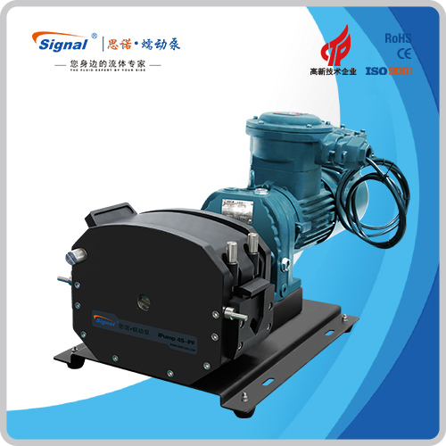 1.流量范圍:1.5-40L/min 2.彈性壓管結構,軟管壽命長,非常適合大流量液體傳輸 3.免維護交流減速電機驅動,變頻器調節轉速 4.全金屬泵頭,高精度,更可靠 5.防爆等級DIIBT4,適合易燃易爆環境使用