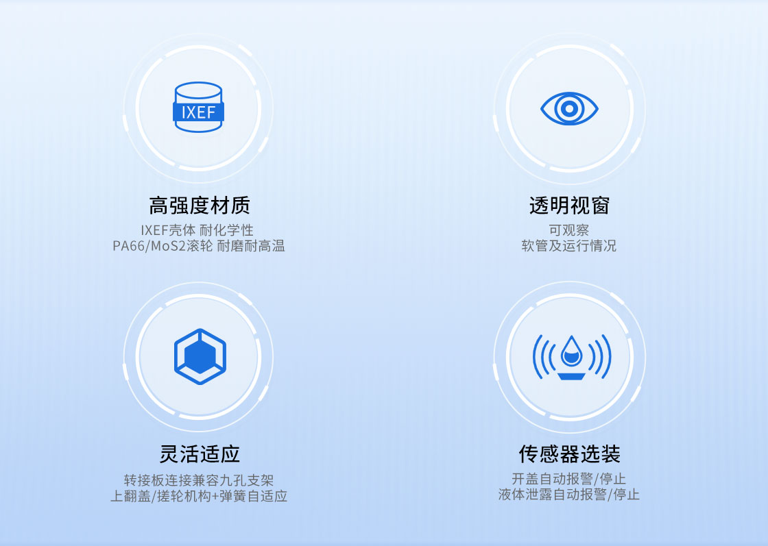 泵頭采用上翻蓋設計實現快速安裝和更換軟管;