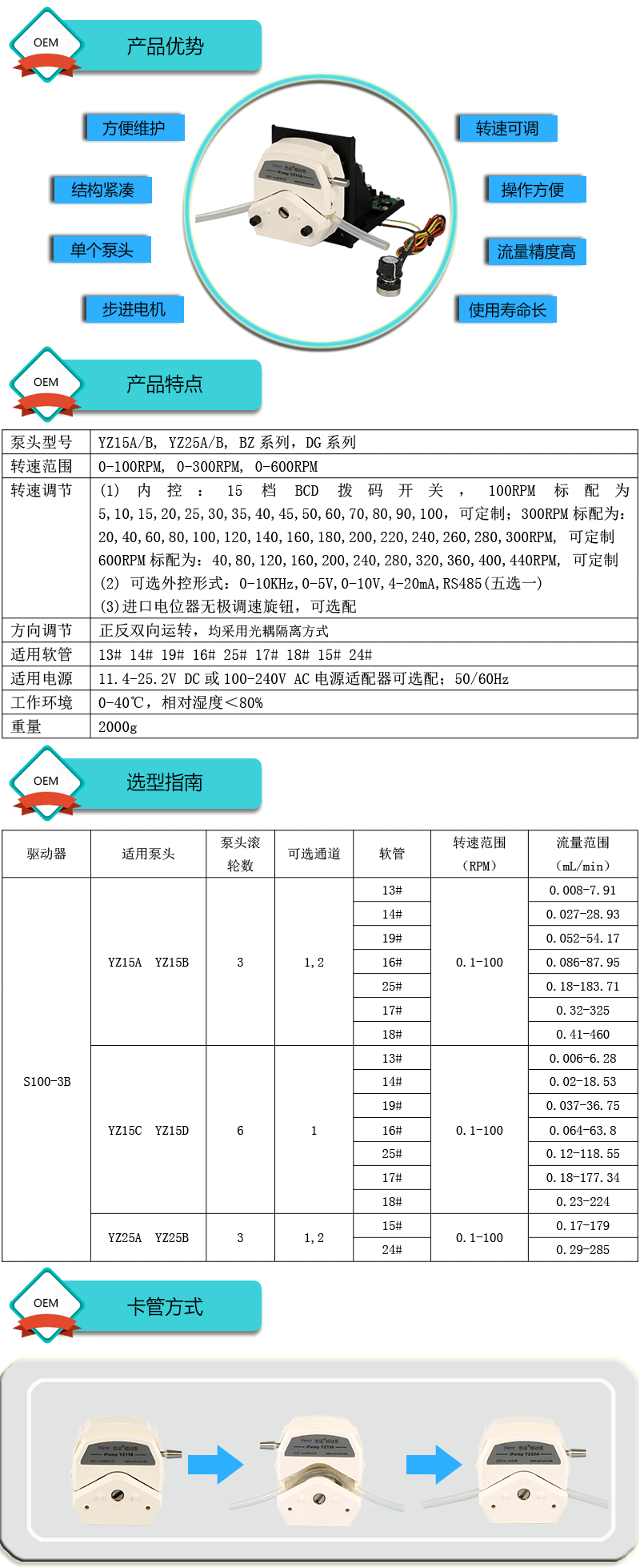 1.流量范圍:0.008-460mL/min 2.步進電機驅動,流量精度高達±1% 3.轉速可調節,多種調速方式可選 4.多種結構可選 5.采用進口電機驅動芯片,性能優越 6.線路板全部三防漆處理