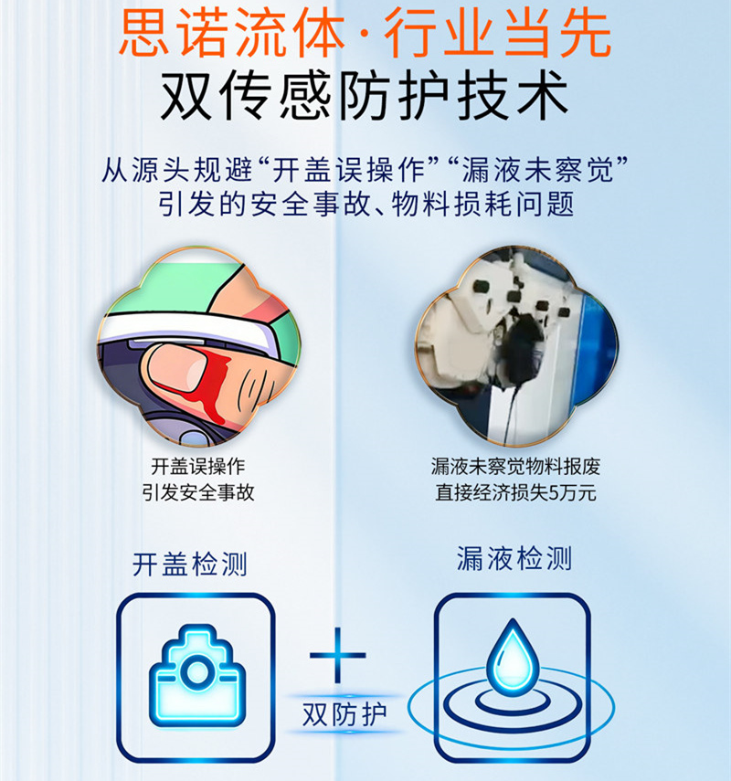 開蓋檢測傳感器如同一位永不疲倦的哨兵,實時監(jiān)測泵頭的閉合狀態(tài)。當(dāng)設(shè)備運(yùn)行中發(fā)生意外開蓋或泵蓋未正常鎖緊時,傳感器能在毫秒級時間內(nèi)識別風(fēng)險,并立即向控制系統(tǒng)發(fā)送信號。系統(tǒng)隨即觸發(fā)停機(jī)指令,整個過程在瞬息之間完成,有效防止了物料噴濺和操作人員傷害。