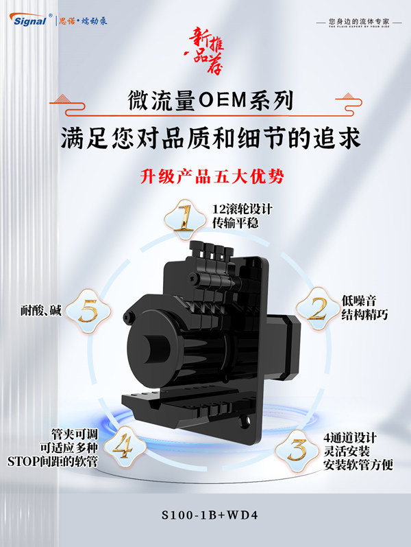 產品有以下特點:1. 12滾輪設計,傳輸平穩(wěn)。微流量OEM系列S100-1B+DD4/XD4/WD4采用12滾輪設計,使得傳輸過程更加平穩(wěn),穩(wěn)定的傳輸效果。