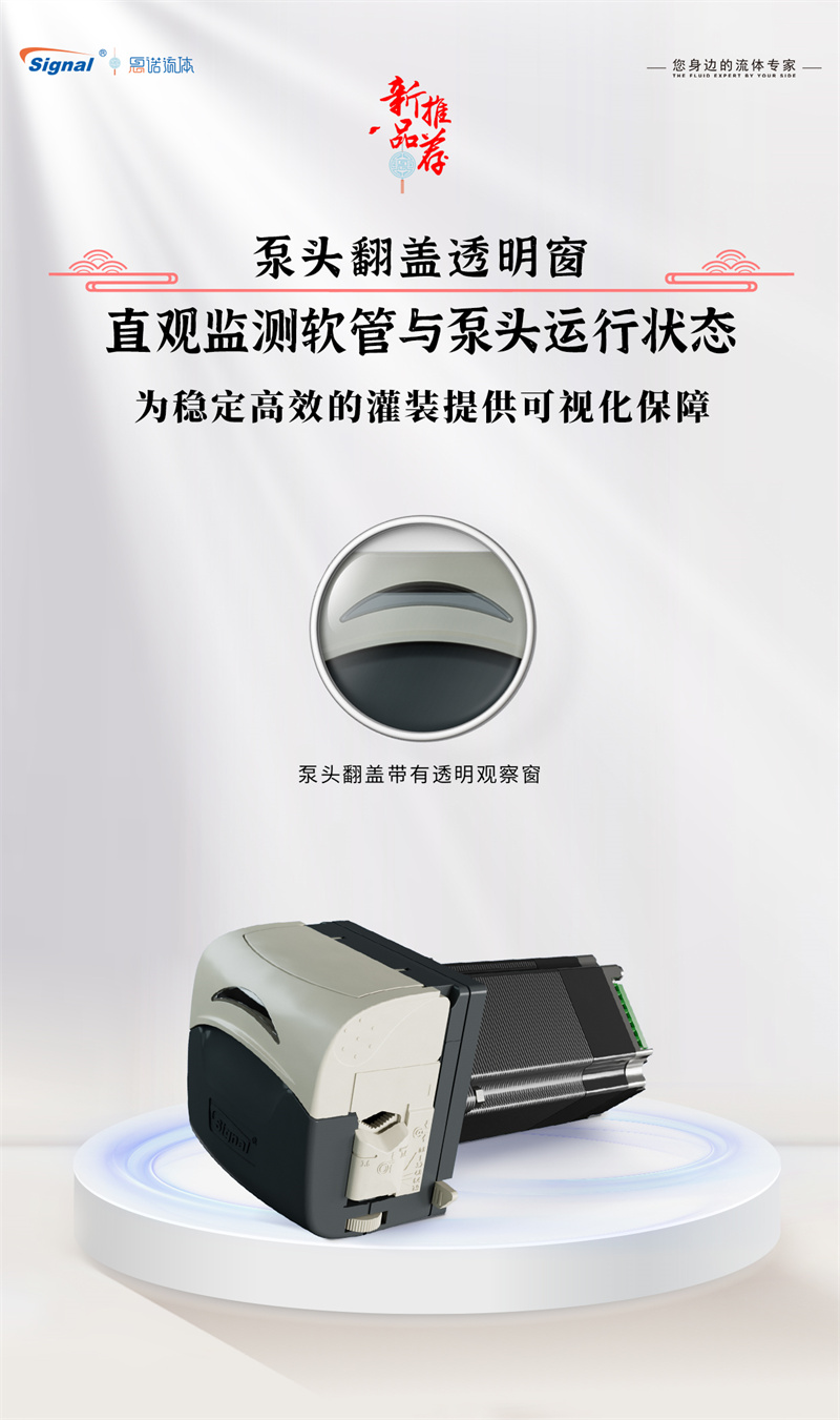2.?透明視窗,運行可視: 創(chuàng)新設計透明觀察窗口,讓您能夠?qū)崟r、直觀地監(jiān)控泵內(nèi)軟管運行狀態(tài)及流體傳輸情況,操作更安心。