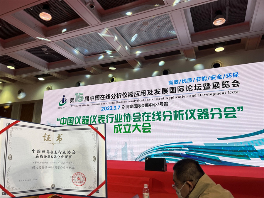 在此熱烈祝賀保定思諾流體科技有限公司在“中國儀器儀表行業在線分析儀器分會”成立大會上榮獲“中國儀器儀表行業在線分析儀器分會理事”榮譽證書。