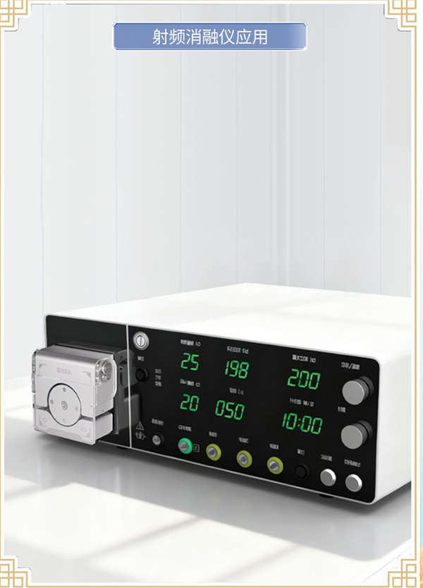 在射頻消融手術(shù)中,電極導(dǎo)管的溫度控制直接關(guān)系到消融效果與患者安全。過(guò)高的電極溫度會(huì)導(dǎo)致組織焦痂、碳化甚至穿孔風(fēng)險(xiǎn)增加。因此,術(shù)中需要一套穩(wěn)定可靠的冷卻循環(huán)系統(tǒng),將無(wú)菌冷卻液持續(xù)輸送至電極尖端進(jìn)行降溫。思諾FY15L蠕動(dòng)泵正是為此場(chǎng)景設(shè)計(jì)的理想配套方案。